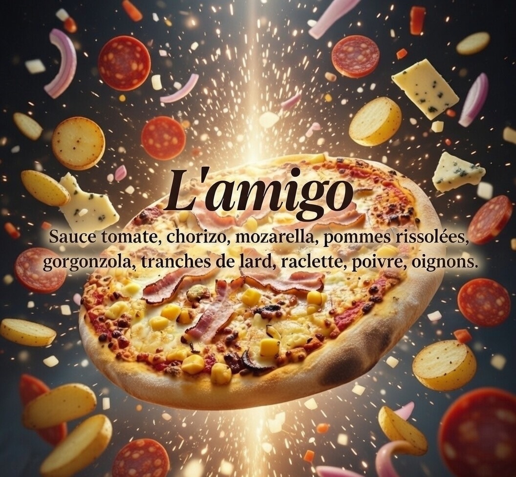Sauce tomate, chorizo, mozarella, gorgonzola, pomme de terre, tranche de lard, raclette, poivre, oignons